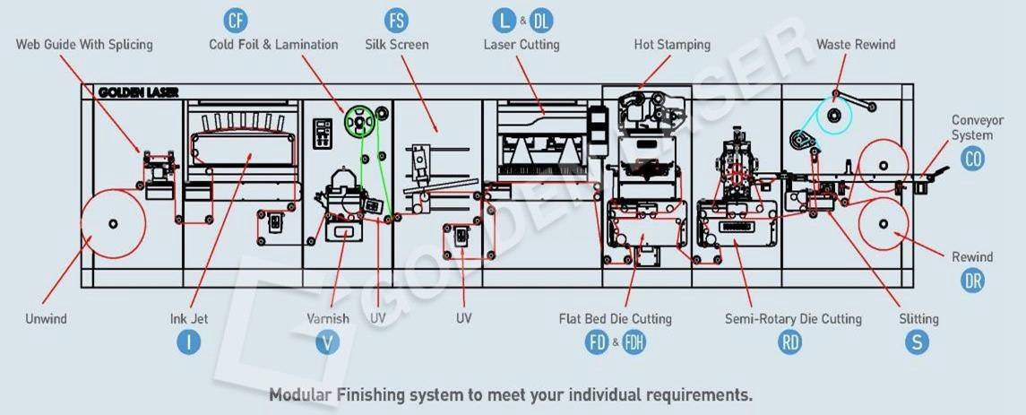 Modular multi-station functions such as flexo printing, laminating, UV varnishing, slitting, and rewinder, etc.