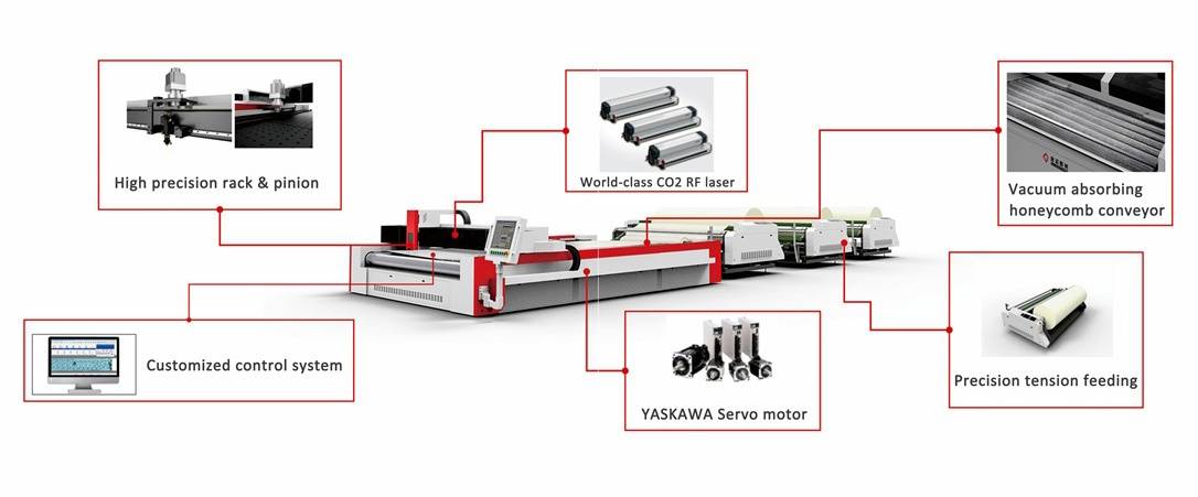 Auto-feeder: Tension correction and feeding with laser cutter for continuous feeding and cutting.